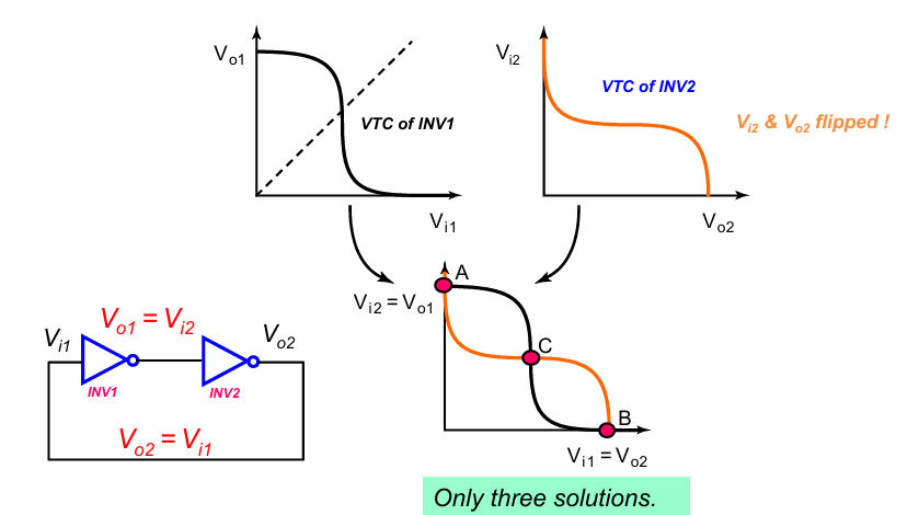 这个蝶形关系意味着,关于2个反相器的输出电压$V_{o1}$,$V_{o2}$有3种可能的解,分别对应图中的A,B,C点,并且解A,B对应的状态是很稳定的,如下图所示: