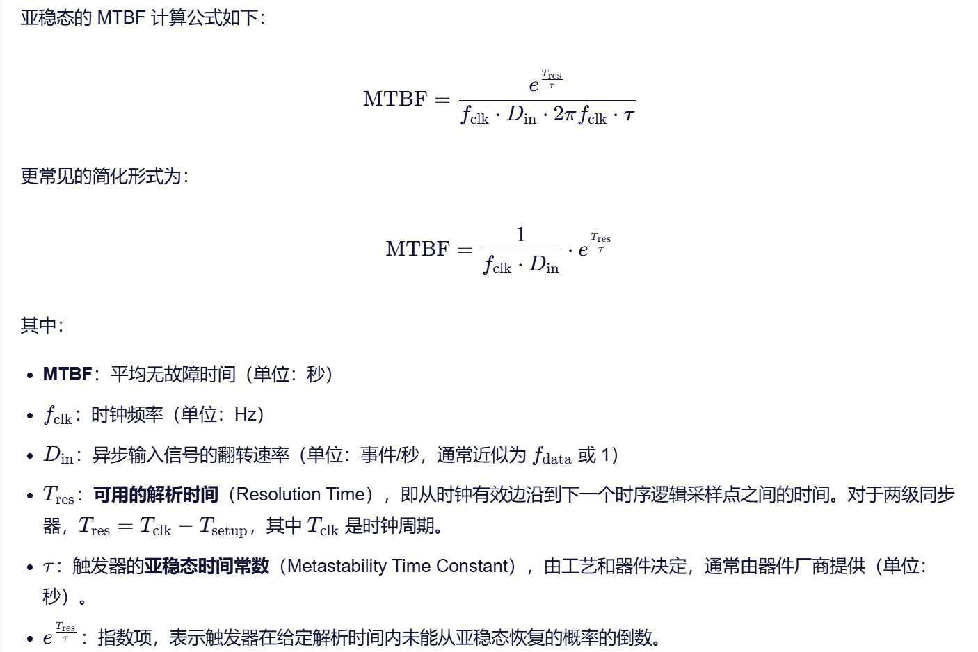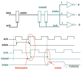 需要指出的是,亚稳态的产生无法消除,仅能尽量避免。亚稳态的产生是一个概率事件。只需要保证MTBF(Mean Time Between Failure)大于某个阈值,芯片就是可用的。