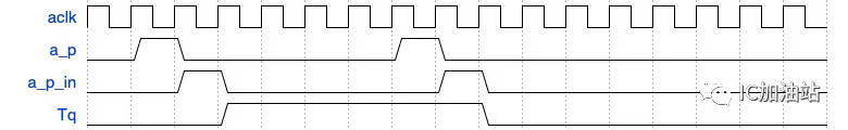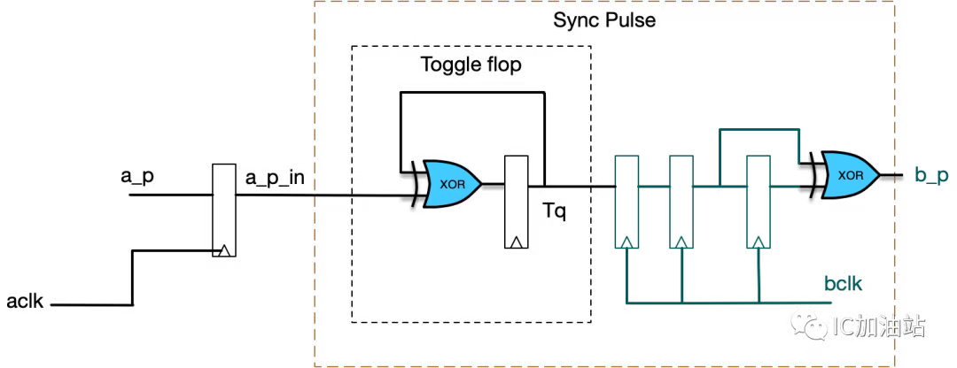 图中的Toggle flop能够将一个脉冲信号转换为电平信号,经过2级跨时钟同步后,在用一个异或门将电平信号转换为脉冲信号。