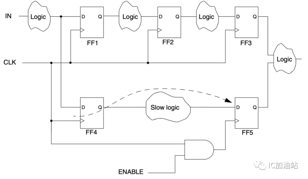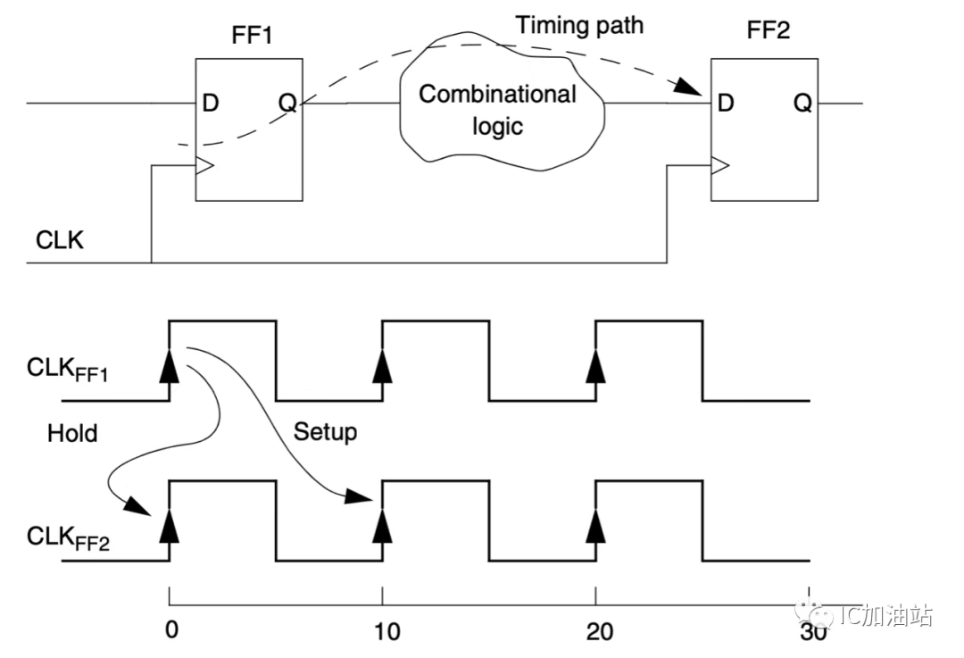 在多数电路中,2级Flip Flop之间的组合逻辑经由一个周期的时长就能完成计算稳定下来。如上图中,0时刻FF1的Q端变化,10时刻前,FF2的D端达到稳定(建立时间),之后10时刻,FF2的Q端对D进行采样。